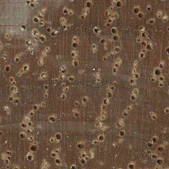 Sapwood is light colored, distinct from heartwood which is reddish brown.